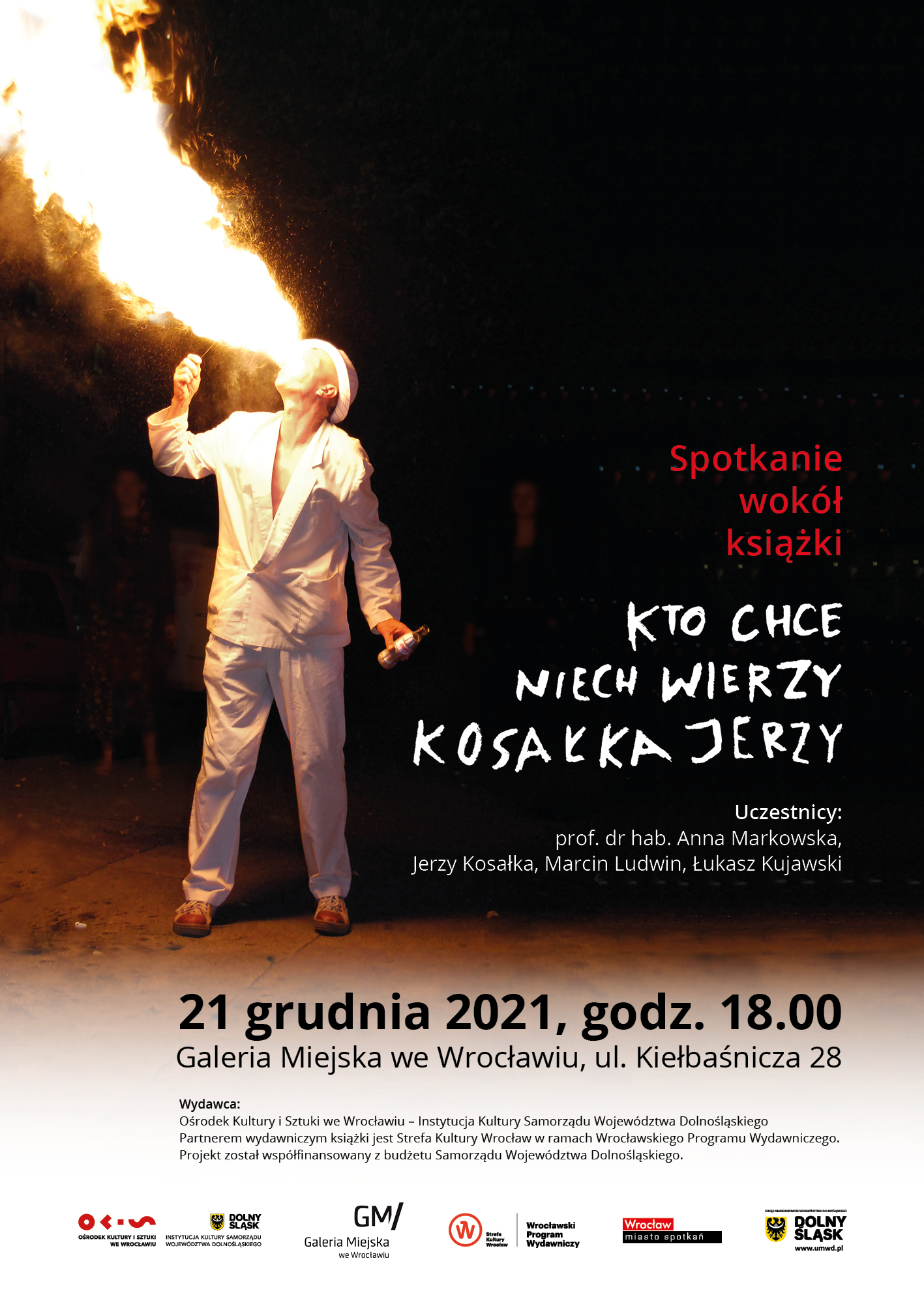Serdecznie zapraszamy we wtorek 21 grudnia 2021 roku o godz. 18.00 do Galerii Miejskiej we Wrocławiu (ul.Kiełbaśnicza 28) na spotkanie wokół książki Kto chce niech wierzy Kosałka Jerzy, wydanej przez Ośrodek Kultury i Sztuki we Wrocławiu.